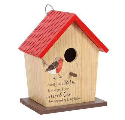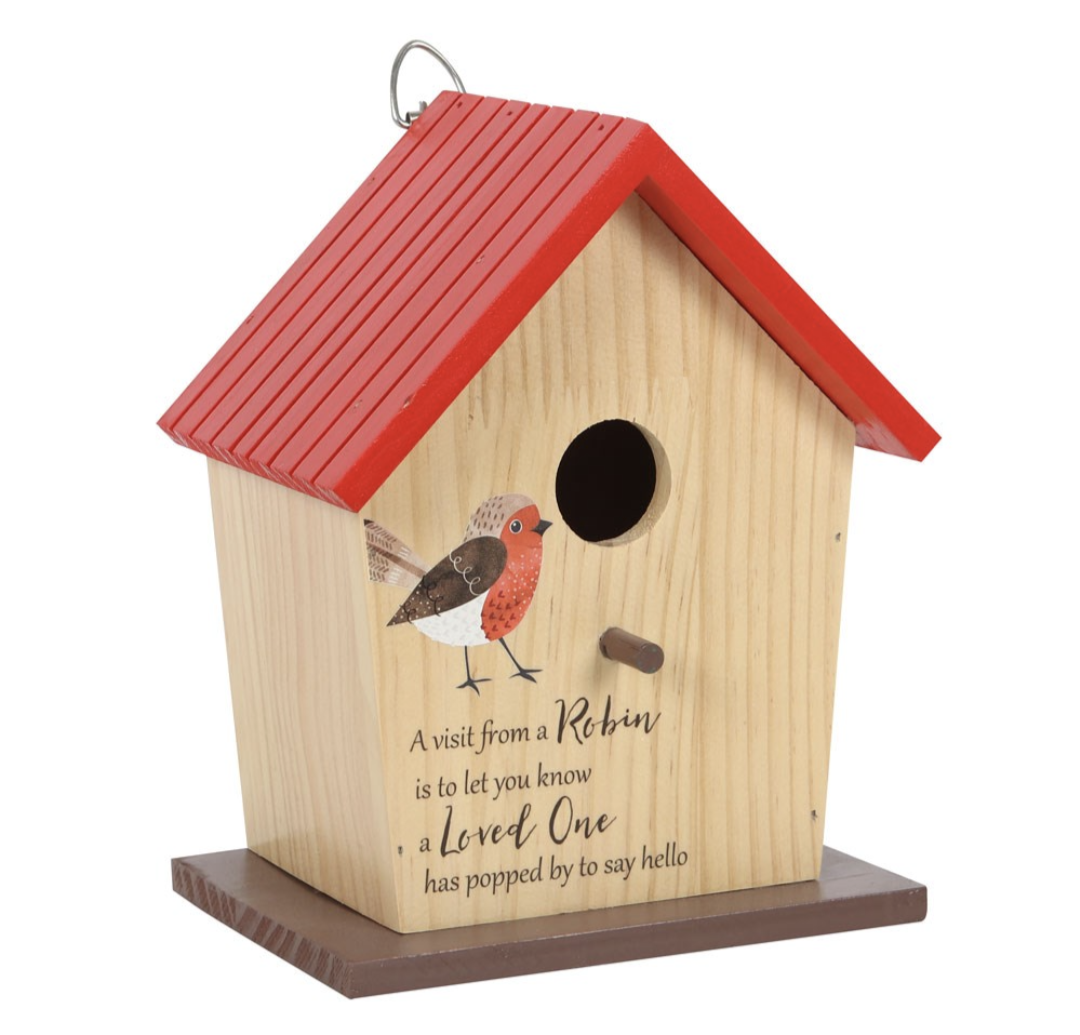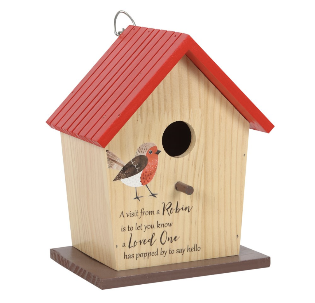Memorialise loved ones with this meaningful wooden birdhouse. Features 'A visit from a robin is to let you know a loved one has popped by to say hello' text and will make a truly heartfelt gift or garden accessory to place in a lost loved one's favourite outdoor spot. Product Dimensions: H20.5cm x W16.5cm x D12cm Packaged Dimensions: H21.5cm x W17cm x D13cm