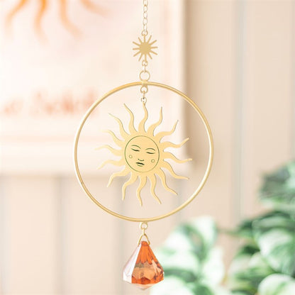 Brighten any space with this stunning Gold Sun Suncatcher. Featuring a large circular frame, the contemporary sun design hangs gracefully within, complemented by a vibrant orange crystal ornament at the bottom. The gold finish adds a touch of elegance, creating a warm, radiant glow when sunlight hits